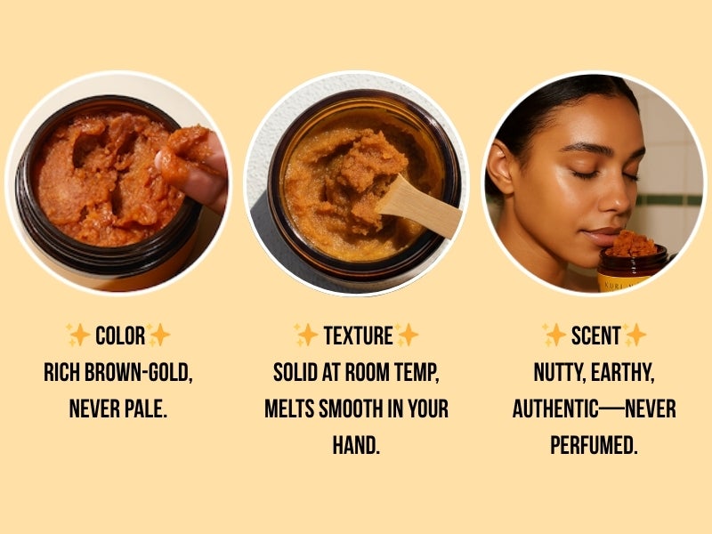 Real Batana oil has three markers fake oil can't replicate. Smell: Real Batana smells earthy and smoky like coffee—if it smells sweet or floral, it's fake. Texture: Real Batana is solid or semi-solid at room temperature and melts in your hands—if it's thin and liquid, it's been refined or diluted. Color: Real Batana is rich brown or tan—never clear, green, or yellow. If your oil doesn't have all three, you've been scammed.